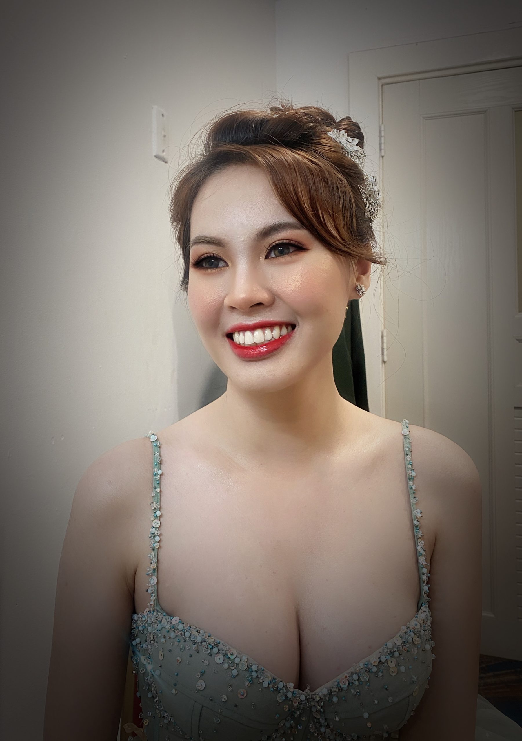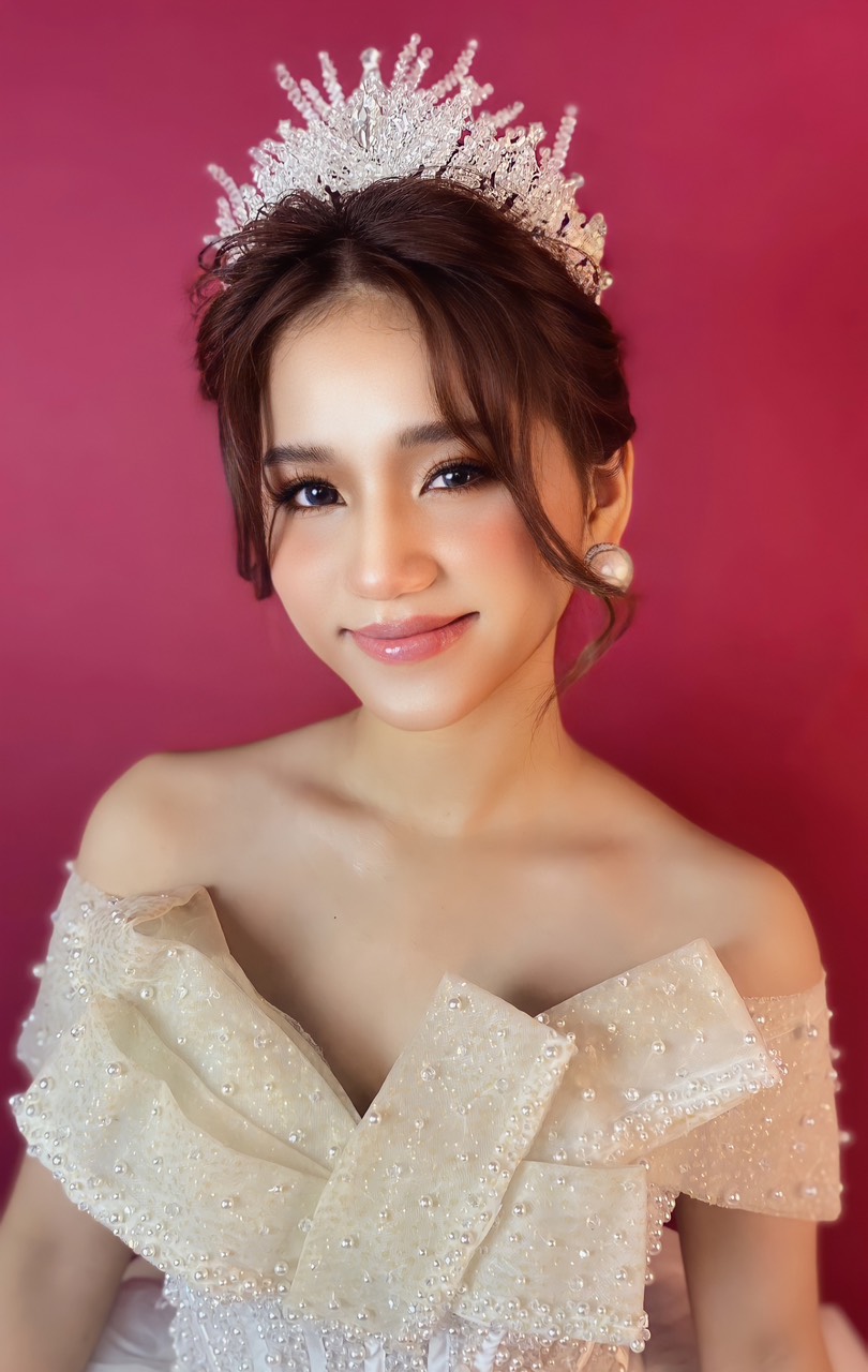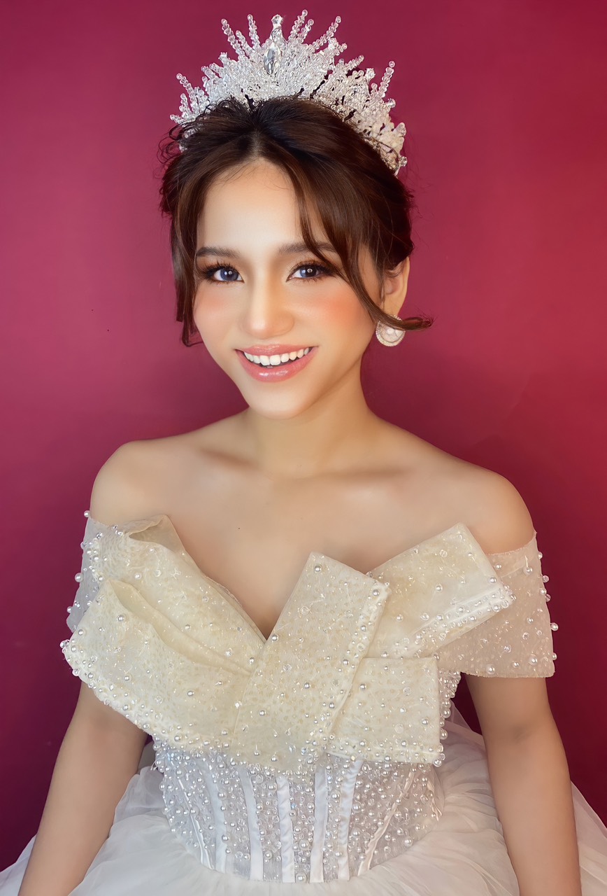 Cô dâu được trang điểm với phong cách sang trọng. Khuôn mặt của cô ấy được trang điểm tinh tế với lớp nền mịn và đôi mắt của cô được tô điểm với lớp phấn màu nhũ và đính cườm để tạo thêm điểm nhấn. Cô dâu đang cười tươi với nụ cười rạng rỡ trên môi.