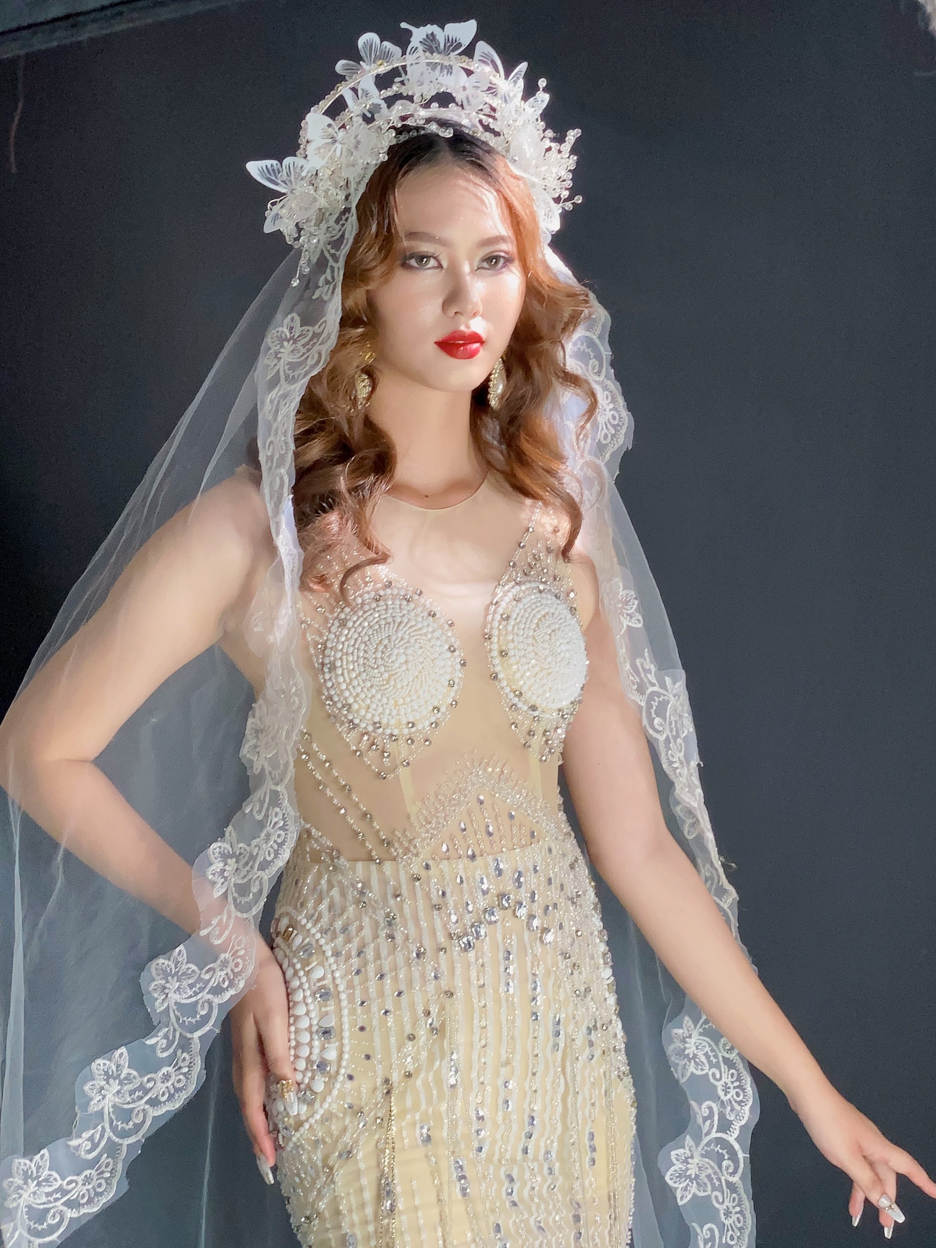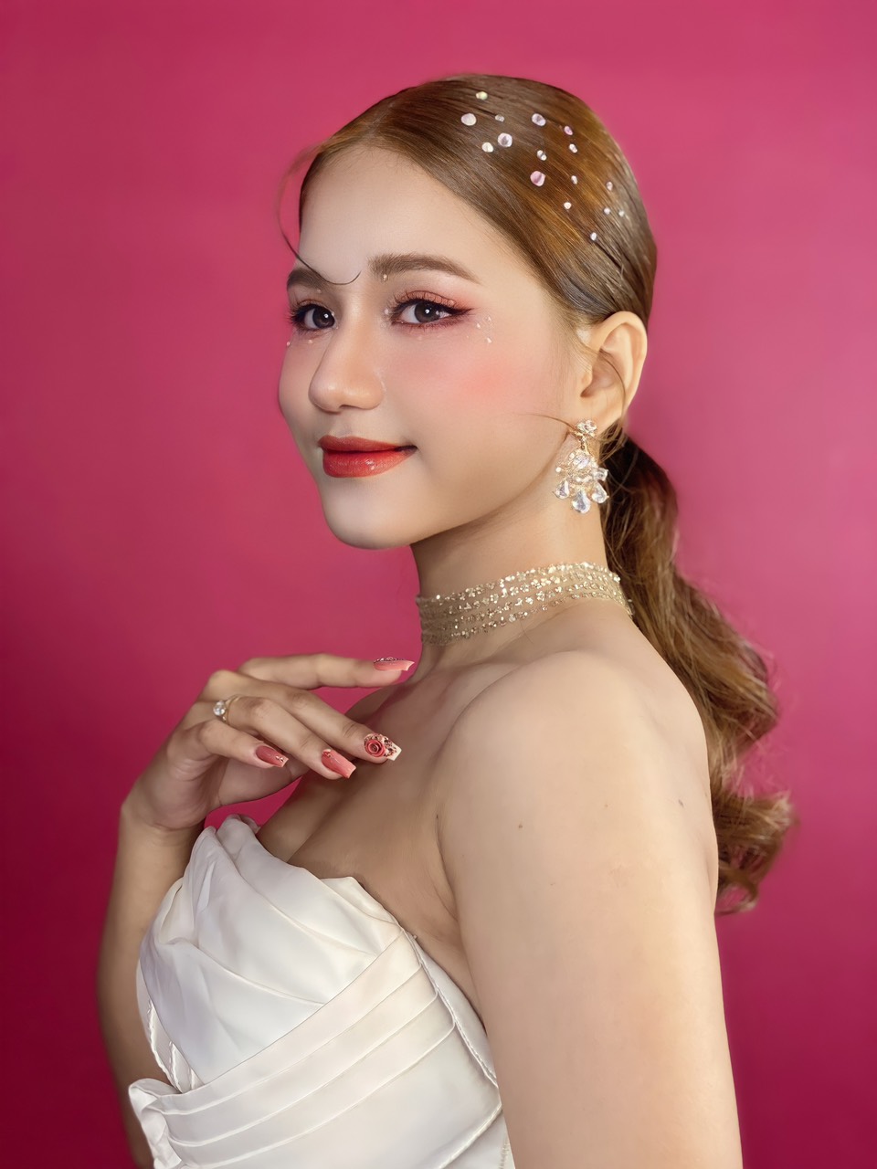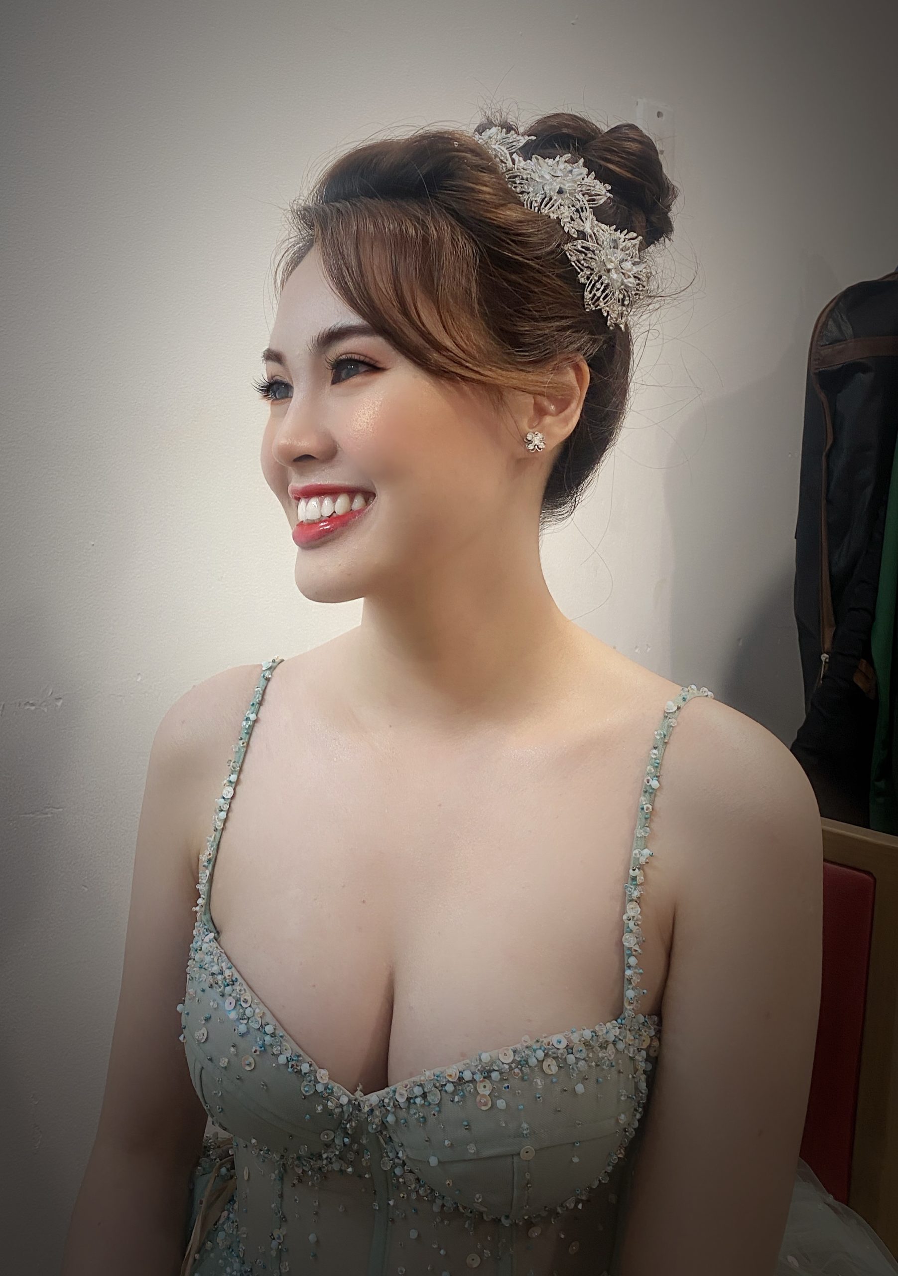 Cô dâu được trang điểm với phong cách sang trọng. Khuôn mặt của cô ấy được trang điểm tinh tế với lớp nền mịn và đôi mắt của cô được tô điểm với lớp phấn màu nhũ và đính cườm để tạo thêm điểm nhấn. Cô dâu đang cười tươi với nụ cười rạng rỡ trên môi.